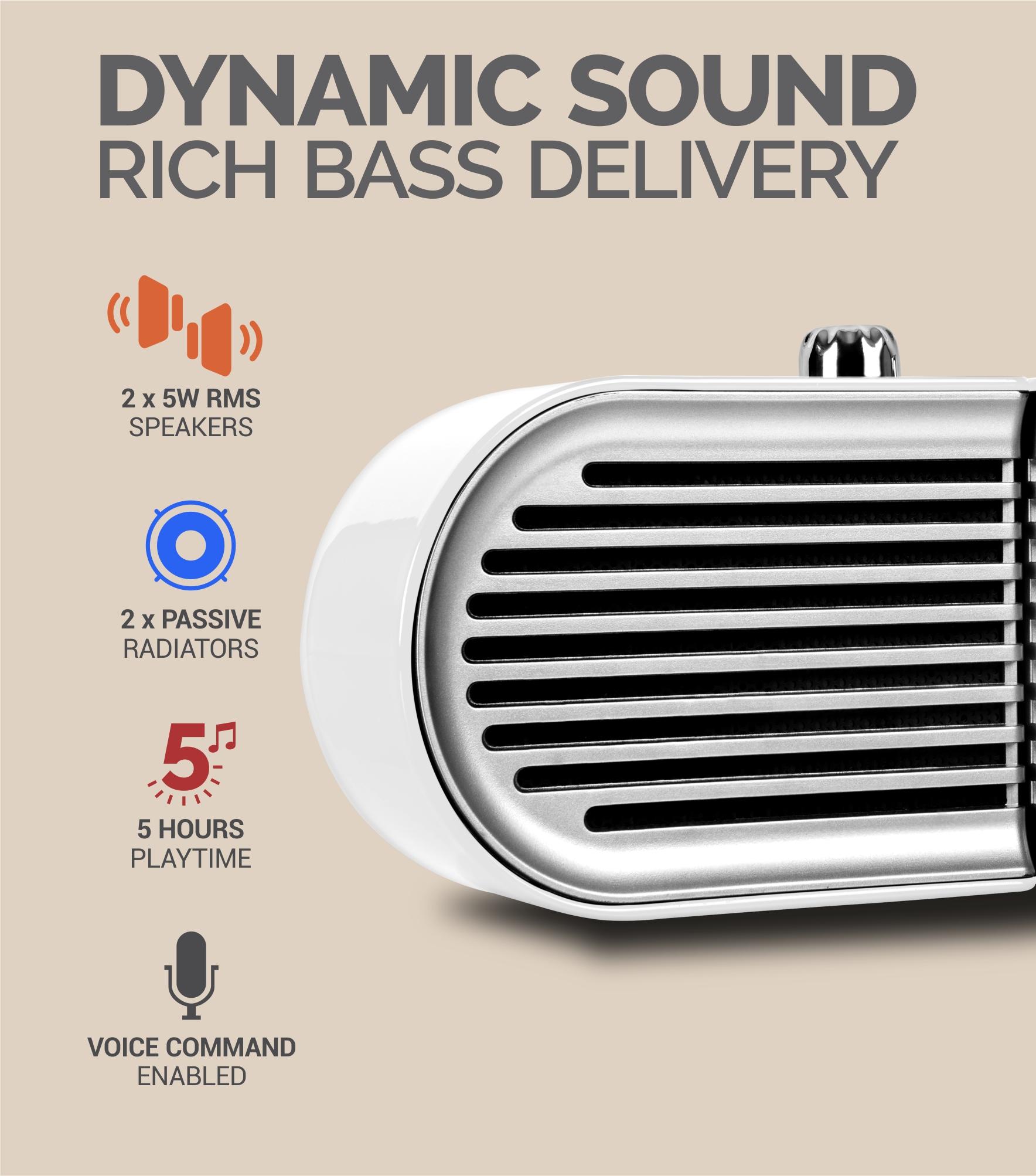 Though small and portable TW200 has a shockingly rich bass and amazing sound delivery, equipped with 10W total RMS output (2 x 5W) and 2 x passive radiators for addtional bass. Enjoy unparalleled rich audio for up to 5 hours continously without interuptions.