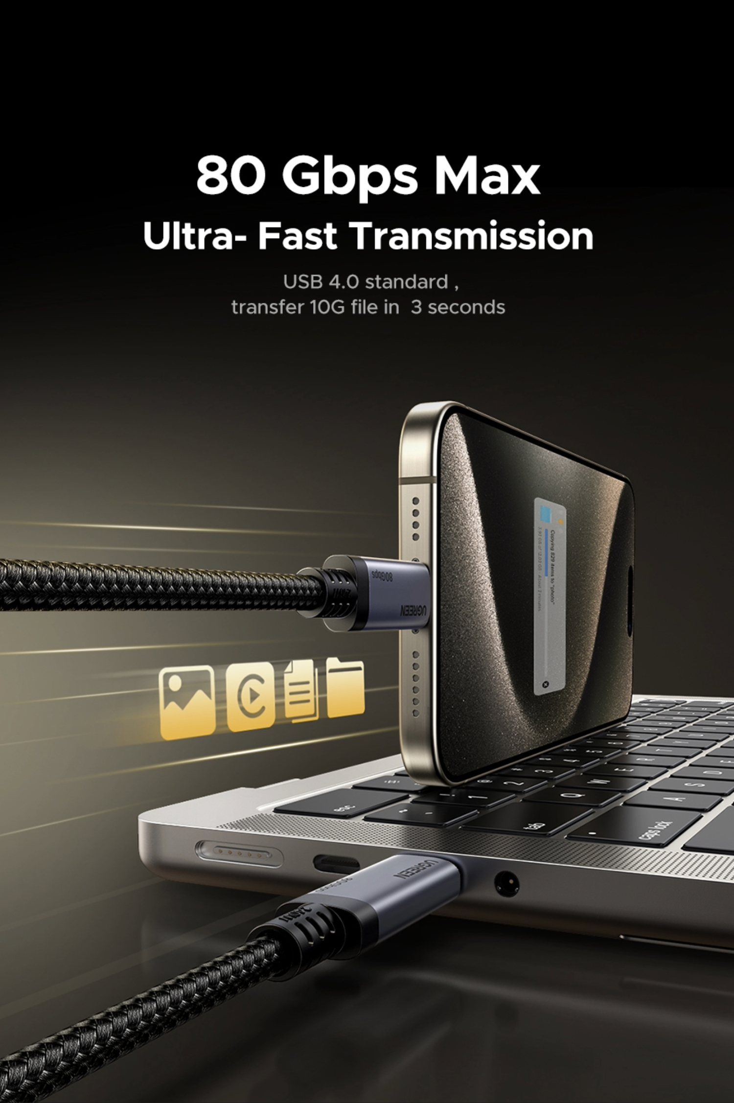 Experience a new standard of device charging and data transfer. This UGreen 240w USB Ccable delivers 240W of Power Delivery 3.1, enabling your MacBook Pro 16-inch to reach 56% charge in just 30 minutes. It is backward compatible with 140W, 100W, and 65W devices, future-proofing your tech ecosystem. With USB4 Gen4 technology, achieve blistering 80Gbps data transfer speeds. This makes it a formidable high speed USB C data cable, moving a 20GB 4K movie in approximately three seconds. This eliminates waiting times, freeing you to focus on productivity rather than file transfers. Trust this robust 240w USB Ccable for superior performance, making it an essential high speed USB C data cable for any professional. This powerful USB C to USB C cable excels, a truly indispensable high speed USB C data cable.