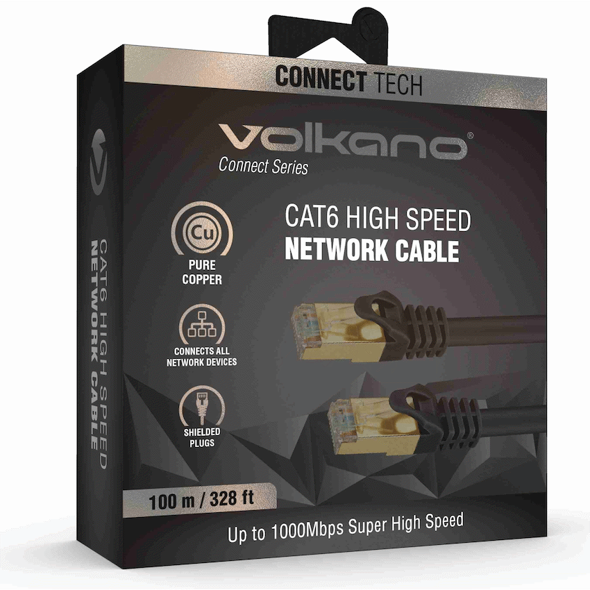 Pure CopperConnects all network devicesDouble shielded and moulded plugs100m Cable lengthCAT6 supports up to 250MHzSupports up to 1000 Mbps1 Year warrantyFor use with network adaptors, hubs, switches, routers,DSL/cable modems, patch panels and other high performancenetwork applicationsWhat’s in the box1 x Volkano Connect series CAT6 Network Cable 100m