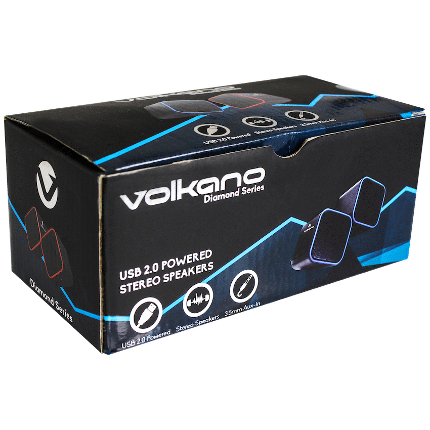 Give your laptop or desktop a clear audio boost with the Volkano Diamond Series USB powered PC speakers. Designed for simple plug-and-play setup, they draw power from any USB port-so there’s no wall adapter required-and connect to your device via a 3.5mm AUX lead for reliable, low-latency sound. Compact and lightweight, they fit neatly beside your monitor or slip into a backpack for study sessions, remote work, and streaming on the go.Despite their small footprint, these 2.0 speakers deliver stereo output of 2 x 3W, ideal for YouTube, playlists, podcasts, and video calls. A frequency range of 90Hz-20kHz keeps dialogue clear and music lively, while 4? impedance provides efficient performance from laptops, desktops, and compatible USB power banks. Setup is quick: plug the USB for power, connect the 3.5mm AUX for audio, and you’re ready-no drivers, no fuss.Whether you’re upgrading tinny built-in speakers or creating a tidy study nook, the Volkano Diamond Series keeps your desk clutter-free and your audio crisp, with a stylish Blue finish to brighten your workspace.