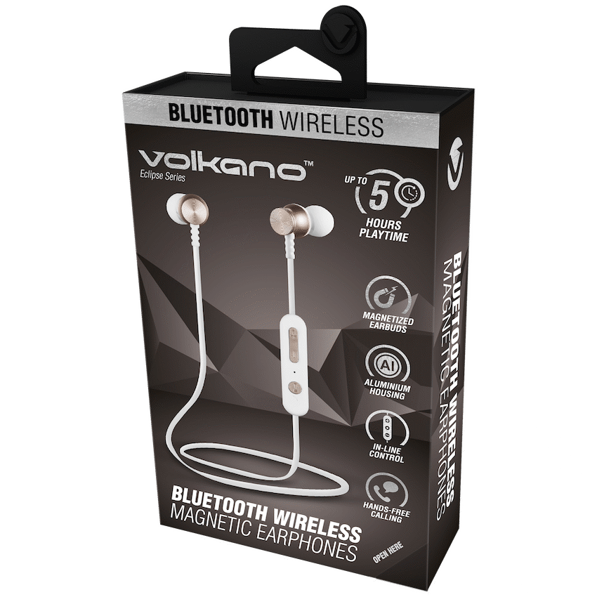 Stay connected in style with the Volkano Eclipse Series bluetooth wireless earphones that come designed with an aluminium housing for a timeless sleek and shiny look and feel. Coming standard with in-line control as well as hands-free calling allows you to move around with ease while staying connected and in the loop with both your music and communication needs. Magnetized buds allow the product to be safely and compactly stored when not in use. These lightweight earphones have up to 5 hours playtime with a charging time of 1 hour. This product comes with a USB charging cable as well as different Earbud cap sizes to better suit each individual consumer and ensure maximum comfort.