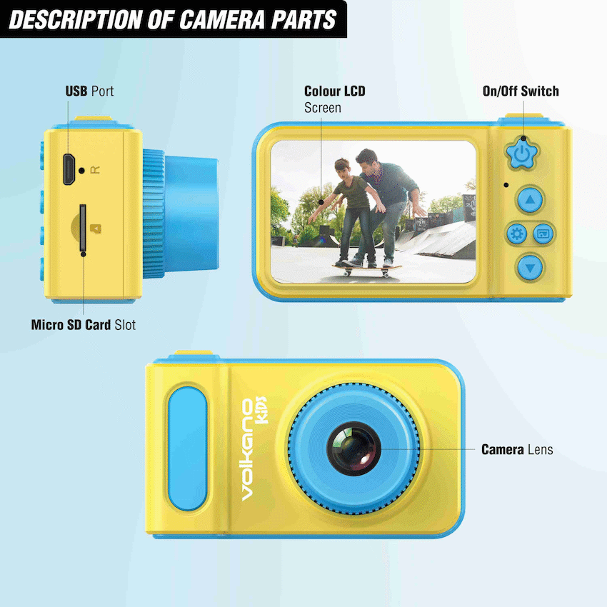 Specifications:- Chipset: JR3262+0309+4P Lens- Kid’s Game: Sneak / Sokoban / Maze / Guess / Fighting- Auto Off: Off / 1 / 3 / 5 Minutes- 2.0 Inch LCD Screen- 90deg Wide Angle Lense- Image Resolution: 3 MP- Video Resolution: 1280 x 720 – Up to 1080- Input / Output: Micro USB- Battery: 400 mAh- Storage: Micro SD Card 32 GB Max (excl)FEATURES AND BENEFITS:- 720p HD Video Recording- Up to 90 Mins Recording- 2.0 Inch LCD Screen- 90deg Wide Angle Lens- 4 Different Photo frames- 10 Photo Frames to pick fromWhat’s in the boxVolkano Kids Shutterbug Series Digital CameraMicro USB Charging CableLanyardInstruction Manual