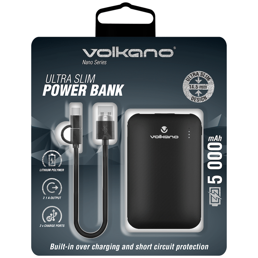 Never be caught without battery on your device ever again whether you re on the go or caught up in load shedding. The Volkano 5000mAh Nano Power Bank boasts an Ultra Slim 12mm thick design and features two USB charge ports, LED battery indicator and includes a Micro-USB charging cable. Features:On-The-Go Charging for your phone or tabletLED Battery Indicator2 x Charge PortsMicro-USB input2.1 Amp ChargingUltra Compact size5000mAh CapacityBuilt-in over charging and short circuit protectionSpecifications:Input: 5V DC, 2 AOutput 1: 5V DC, 2.1 AOutput 2: 5V DC, 2.1 ABattery Capacity: 5000mAhBattery Type: Lithium PolymerWhat’s in the box1 x Volkano Nano Series 5000mAh Power Bank1 x Micro-USB charging cable