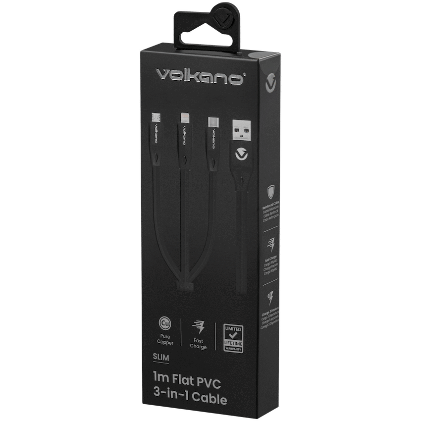 Simplify your charging routine with the Volkano Slim Series 3-in-1 Flat PVC Charging Cable. Delivering up to 30W of power, this durable and reinforced cable features a USB-A input and three output connectors-Micro USB, Type-C, and Lightning-allowing you to charge up to three devices simultaneously. Its flat, tangle-free design and 1-meter length make it perfect for everyday use, whether at home, in the office, or on the go.