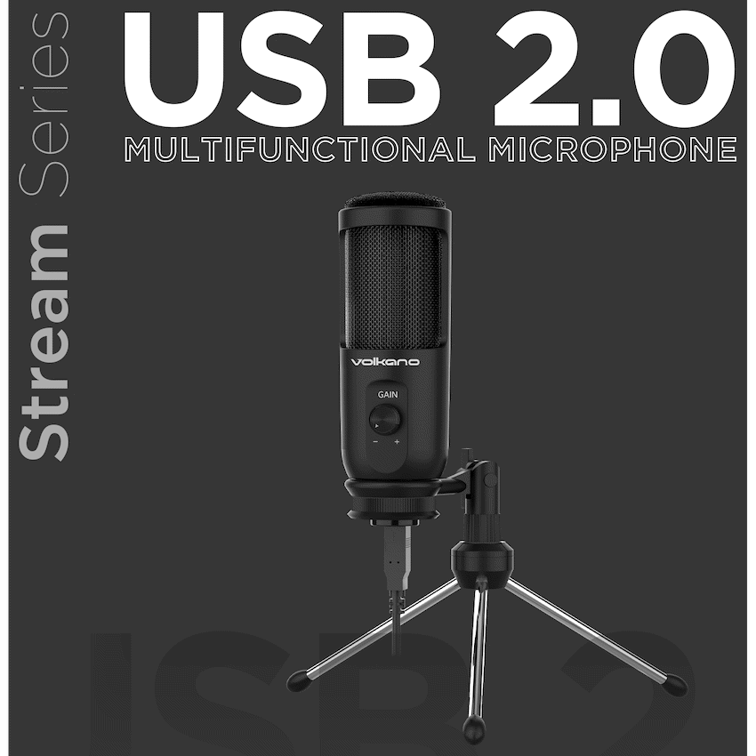 Elevate your gaming, live streaming, and recording experience with the Volkano Stream Series USB 2.0 Multifunction Streaming Microphone. This desktop microphone offers versatile functionality for capturing a wide range of audio, whether it’s your voice or instruments. It’s compatible with computers and laptops, and the mic gain control allows you to fine-tune your audio pickup. Plus, it comes with a convenient Mini Tripod Stand for added stability and flexibility in your setup. Make your streaming and recording sessions stand out with this reliable microphone.Specifications:Mic unit: Cardioid Condenser Pickup pattern: Omni-directional Sampling Rate: 24 Bit, 192 KHz Frequency response: 30Hz – 16kHz Sensitivity: -38 3 dB Impedance: 2.2 K Operation voltage: 5 V Cord length: 1.5 m Connector: USBFor use with computers and laptops Mic Gain Control allows for close-up or further pickupWhat’s in the box1 x Stream Series USB 2.0 – Multifunction Streaming Microphone1 x Mini Tripod Stand
