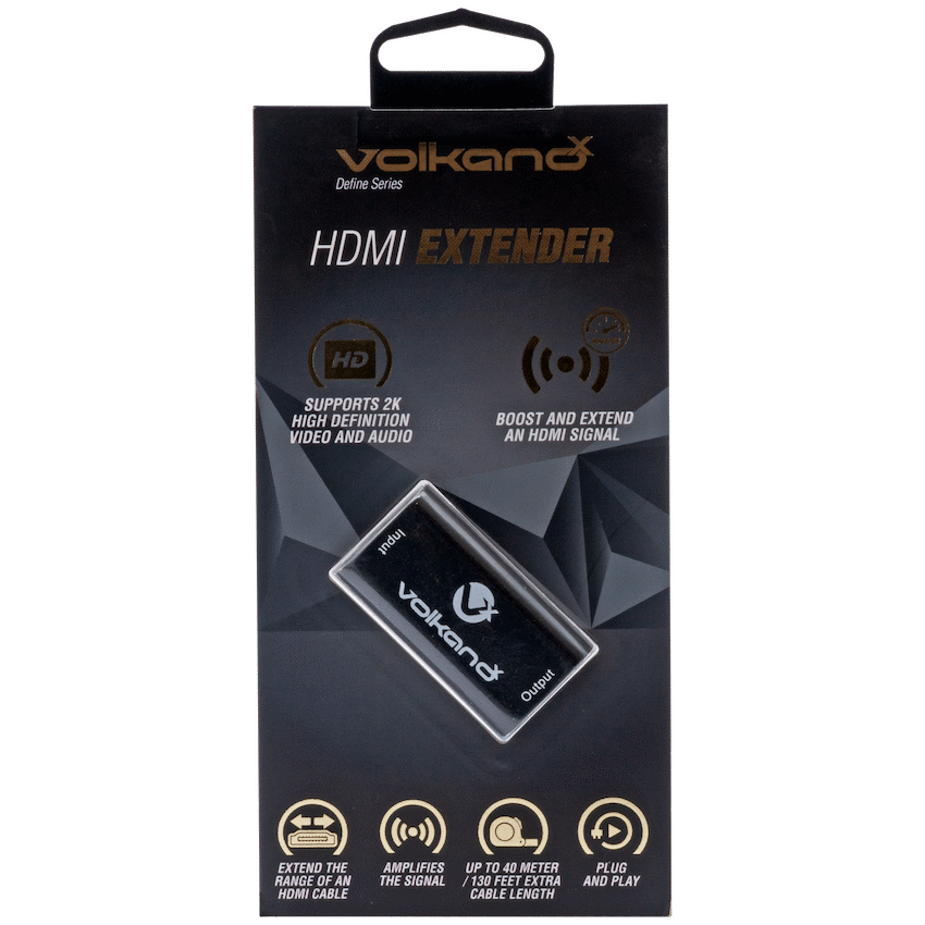 Expand your setup and break free from distance limitations with the VolkanoX Define Series HDMI Extender 40 m. This compact and convenient booster is designed to amplify HDMI signals along your existing cables, enabling crisp, reliable transmission even over extended runs. Whether you’re setting up a projector across the room, enhancing your entertainment system, or organising large-scale presentations, this extender ensures your video and audio stay sharp and uninterrupted.Measuring just a few centimetres, this plug-and-play solution delivers seamless compatibility with HDMI up to 4K @ 30 Hz, delivers multi-channel audio, and requires no external power supply-making installation fast, clean, and hassle-free. Need even more reach? Simply daisy-chain another extender and push your cable length up to 80 m (1080p) or 50 m (4K).