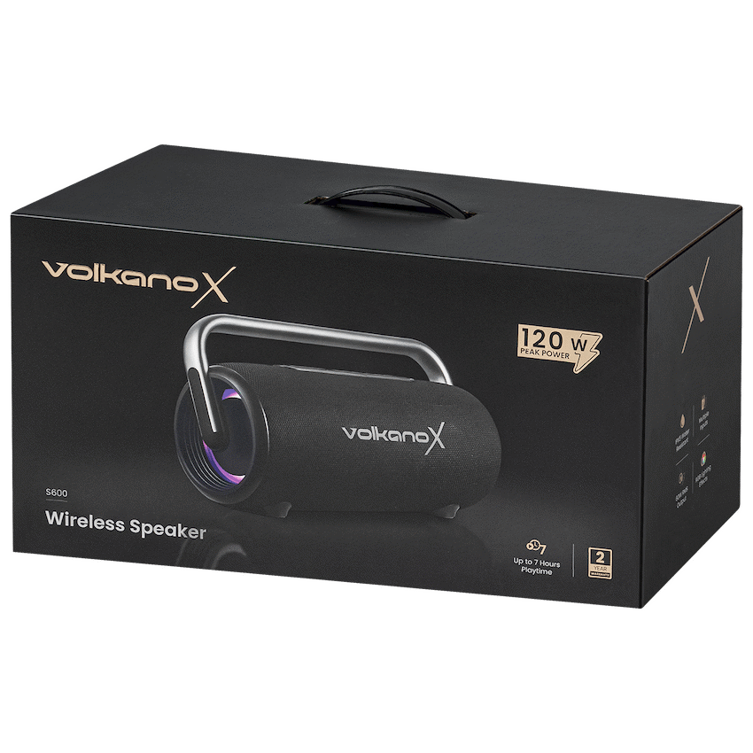 Take your music to the next level with the VolkanoX S600 Portable Bluetooth Speaker. Delivering 60W RMS (120W peak power), this powerhouse speaker brings bold, room-filling sound perfect for parties, outdoor events, and everyday entertainment.With up to 7 hours of playtime at 50% volume, the S600 keeps your playlists going strong. Recharge quickly with standard 5V/2A input or fast charging at 9V/2A. Built with an IPX5 splash-resistant design, it’s ready for outdoor adventures, rain or shine.Set the mood with 2 RGB light modes, and fine-tune your sound with 2 EQ settings. For even more immersive audio, pair two S600 units together with True Wireless Stereo (TWS). The built-in power bank ensures your devices stay charged, while multiple inputs (USB, AUX, Bluetooth) give you versatile playback options.With voice assistant support and a rugged, portable design, the VolkanoX S600 is built for powerful performance anywhere you go.